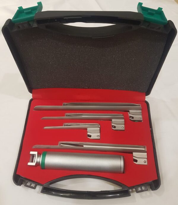 A Miller straight fiberoptic laryngoscope is a medical device, a handle w/ C Size 1.5Volt × 2 batteries-powered for intubation, featuring a reusable, stainless steel straight blades with an integrated fiber optic handle for illumination, a removable light conductor, and compatibility with standard fiber optic handles. Specifications include varying blade sizes (0-4), lengths, widths, high-density fiber counts for bright, cool light transmission, and smooth, mirror-polished finishes for safe, easy cleaning / Disinfection by Sidex Solution or Plasma sterilization.