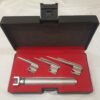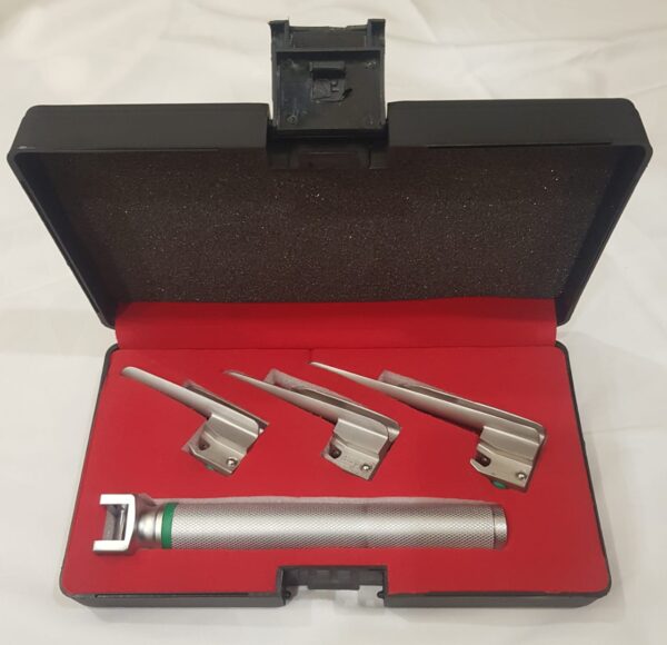 A Miller straight fiberoptic laryngoscope is a medical device, a handle w/ AA Size 1.5Volt × 2 batteries-powered with on/off switch & handle for intubation, featuring a reusable, stainless steel straight blades with an integrated fiber optic handle for illumination, a removable light conductor, and compatibility with standard fiber optic handles. Specifications include varying blade sizes (0-2), lengths, widths, high-density fiber counts for bright, cool light transmission, and smooth, mirror-polished finishes for safe, easy cleaning / Disinfection by Sidex solution or Plasma sterilization.