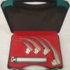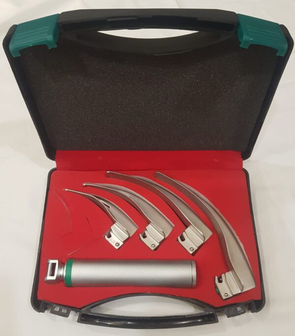 A Macintosh curved fiberoptic laryngoscope is a medical device, a handle w/ C Size 1.5Volt × 2 batteries-powered for intubation, featuring a reusable, stainless steel curved blade with an integrated fiber optic handle for illumination, a removable light conductor, and compatibility with standard fiberoptic handles. Specifications include varying blade sizes (0-4), lengths, widths, high-density fiber counts for bright, cool light transmission, and smooth, mirror-polished finishes for safe, easy cleaning/ Disinfection by Sidex solution or Plasma sterilization.