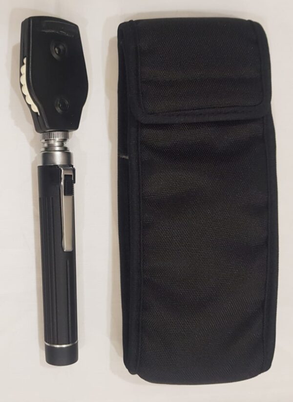 Specification includes a light source (LED, Fiber Optic), a handle w/ AA Size 1.5Volt × 2 batteries-powered & on/off switch and a head with interchangeable components like diopter wheels (for ophthalmoscopes). Magnification, with commonly offering diopter correction lenses from –25 to +40 for examining the eyes.